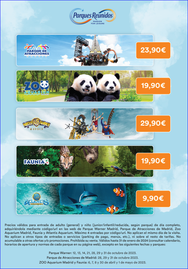 - Parque de Atracciones de Madrid: 23,90 € (-44% sobre precio de referencia).